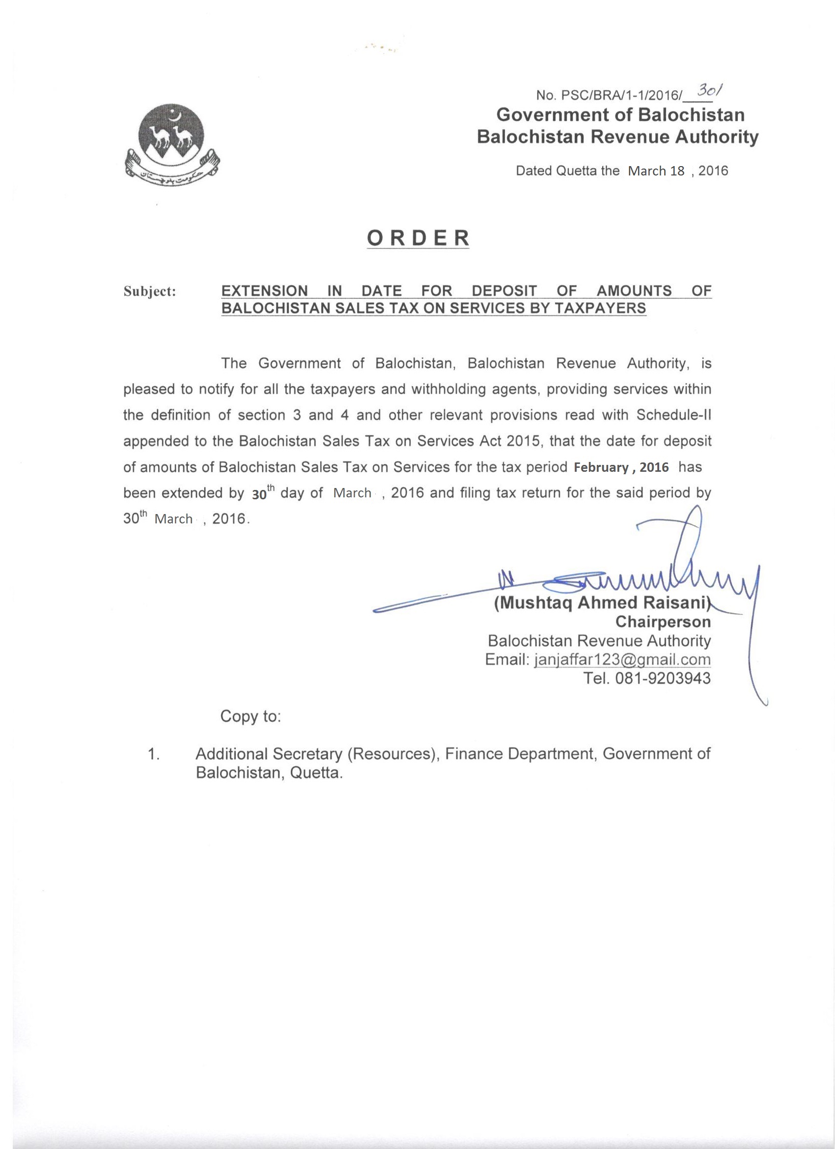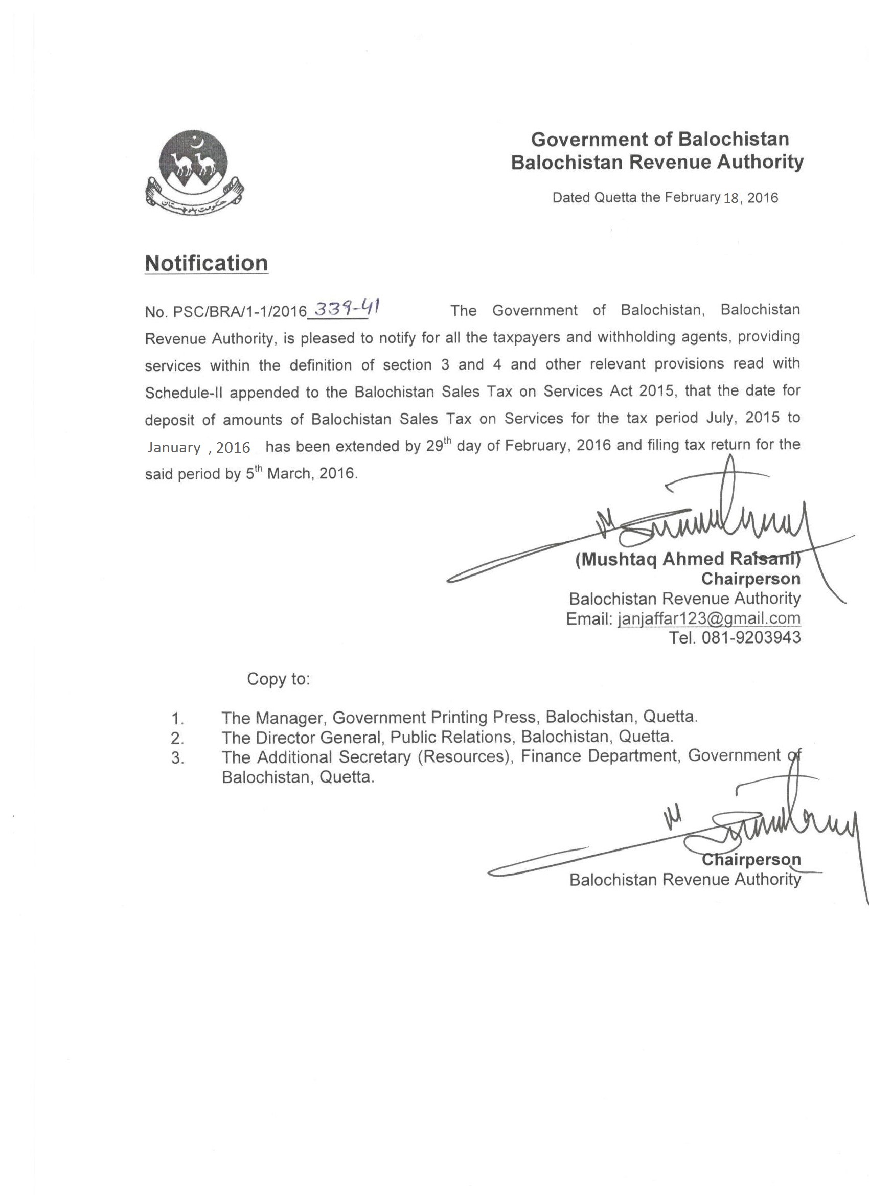 Extension In Date For Deposit Of Amount of Balochistan Sales Tax On Services By Taxpayers 2016 — Notifications_SalesTax