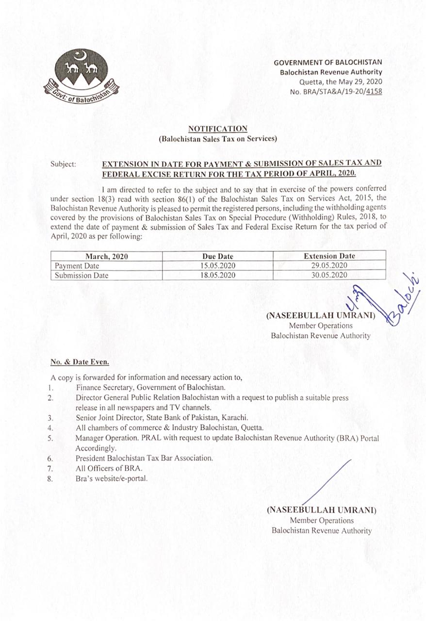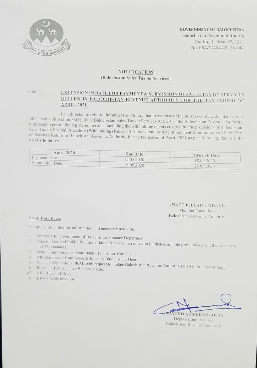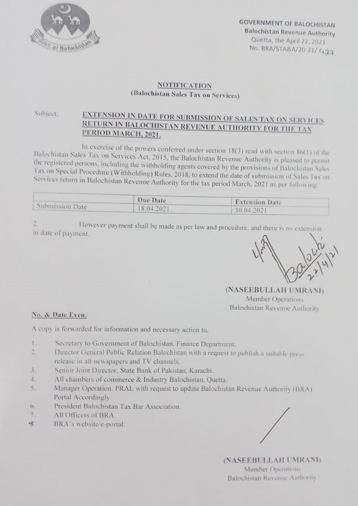 Extension In Date For Deposit Of Amount of Balochistan Sales Tax On Services By Taxpayers — Notifications_SalesTax