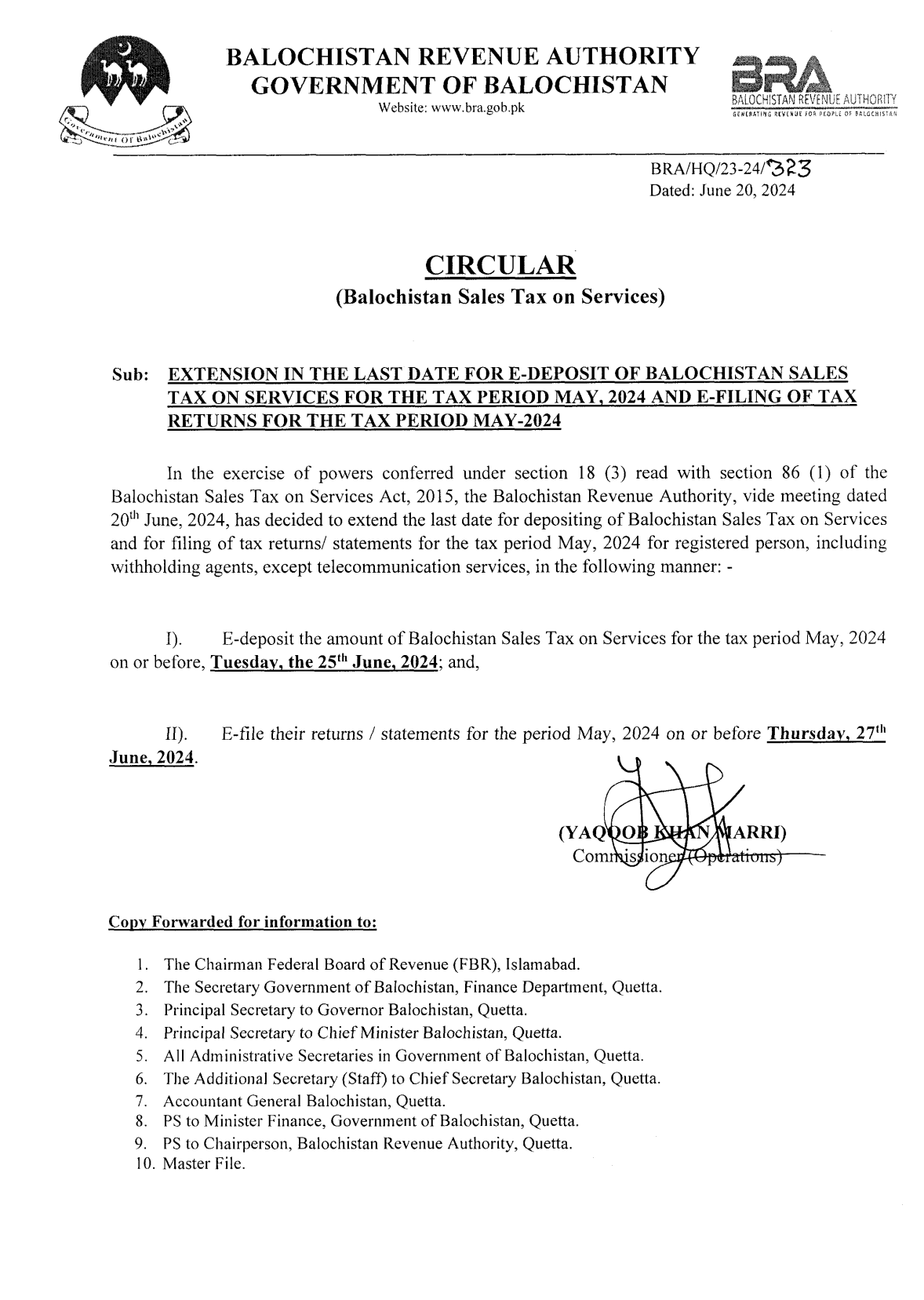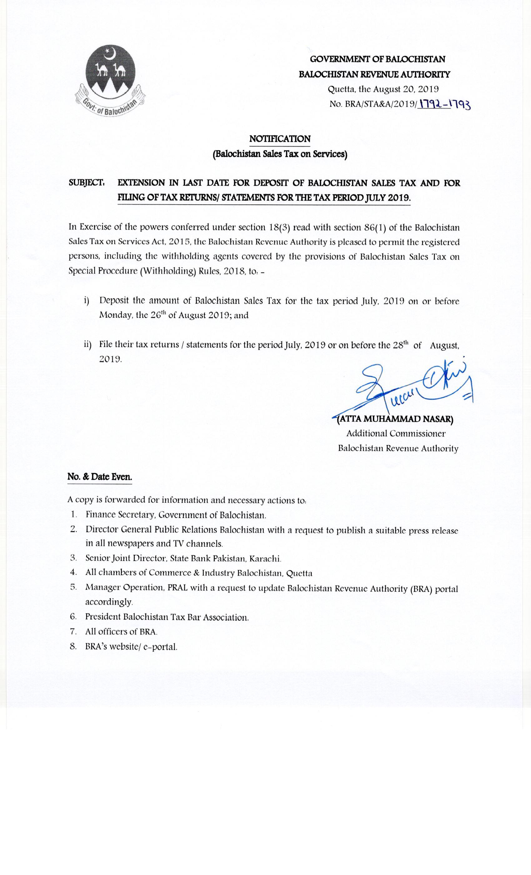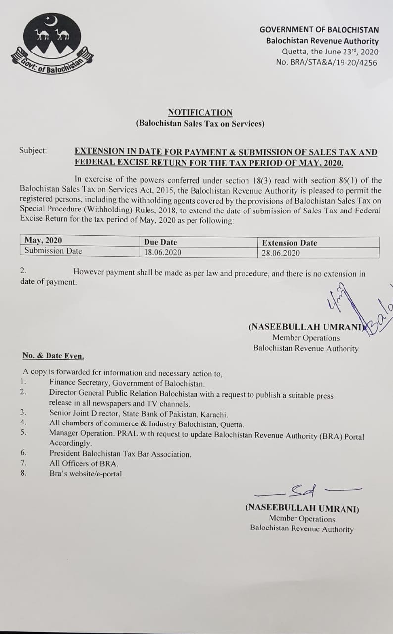 Extension In Date For Deposit Of Amount of Balochistan Sales Tax On Services By Taxpayers — Notifications_SalesTax