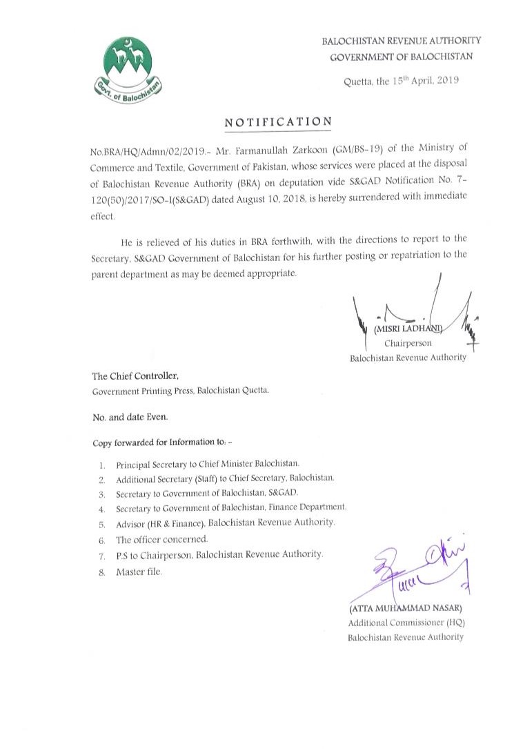 Farmanullah Zarkoon relieved from BRA - Notification — Notifications_Administration