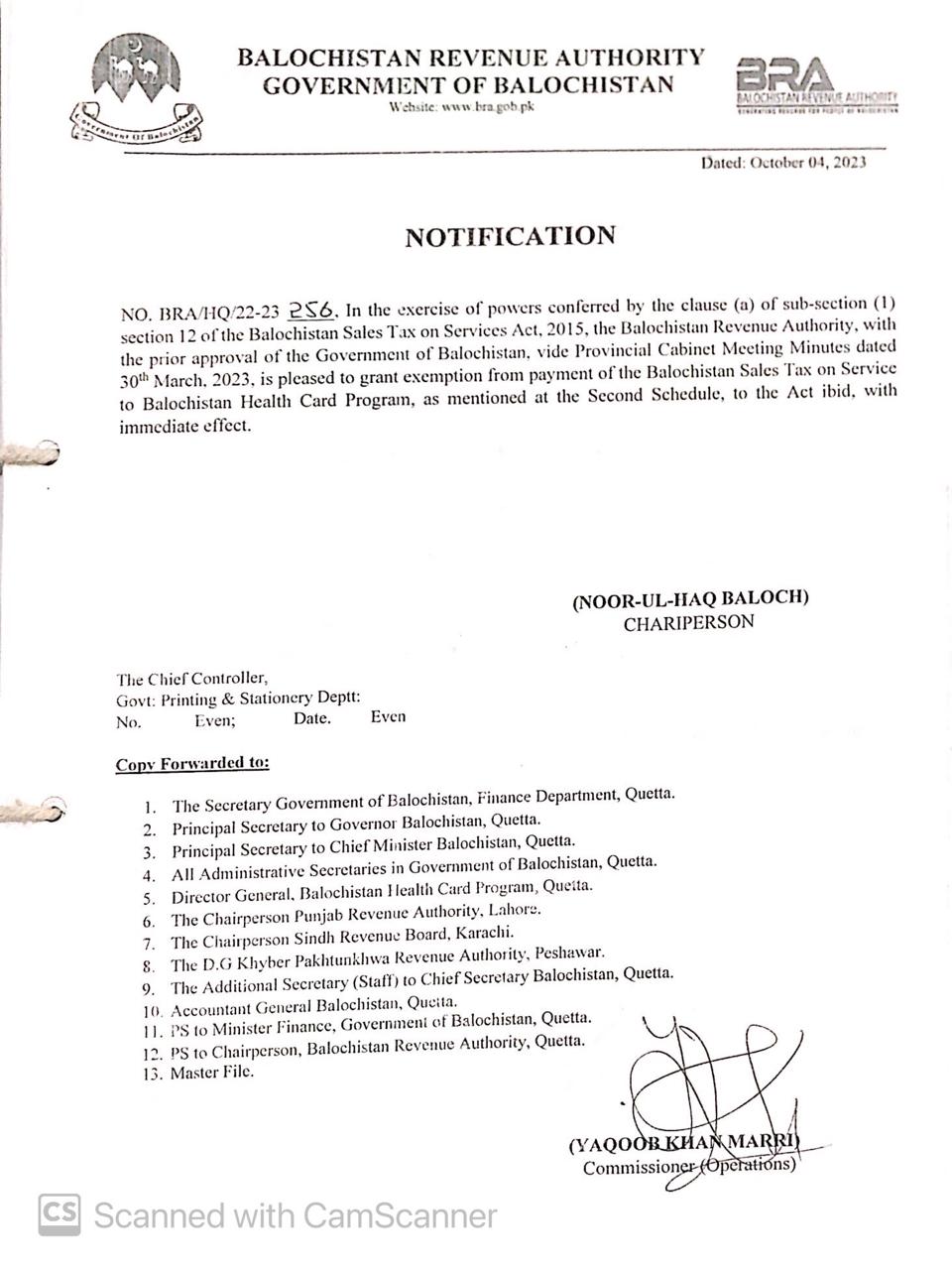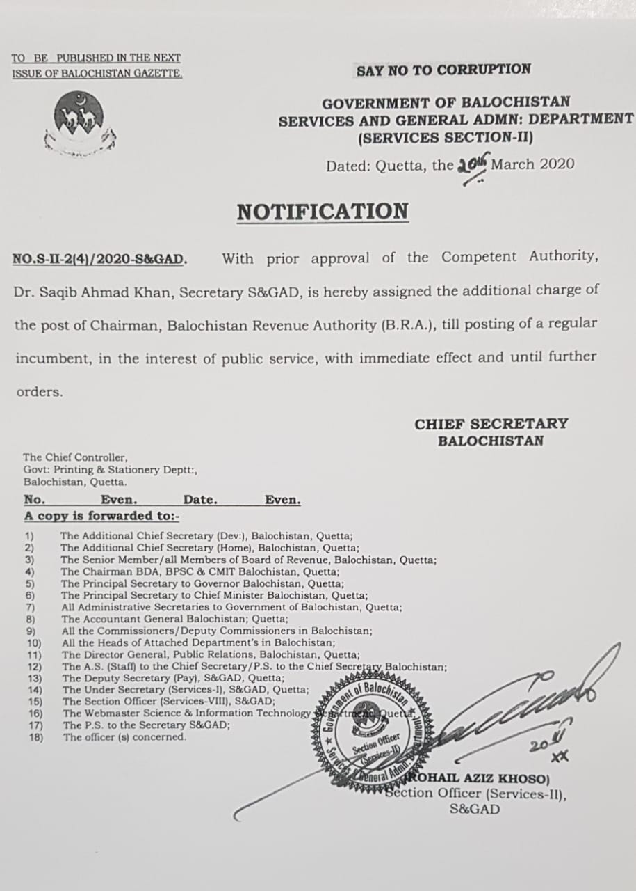 Notification Chairman Balochistan Revenue Authority — Notifications_Administration