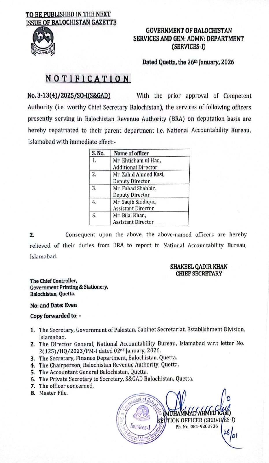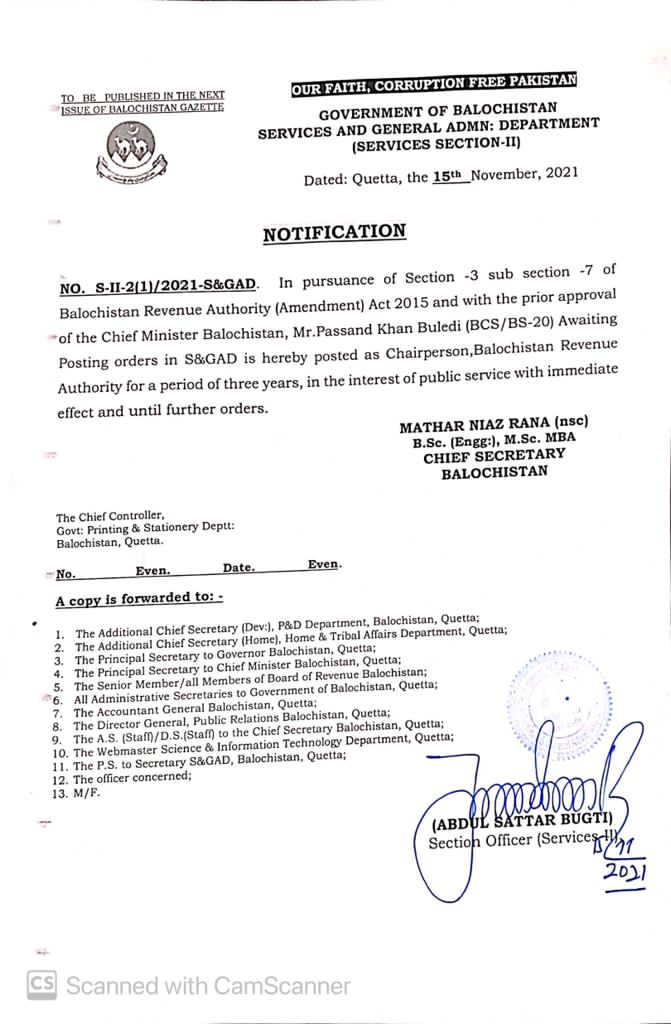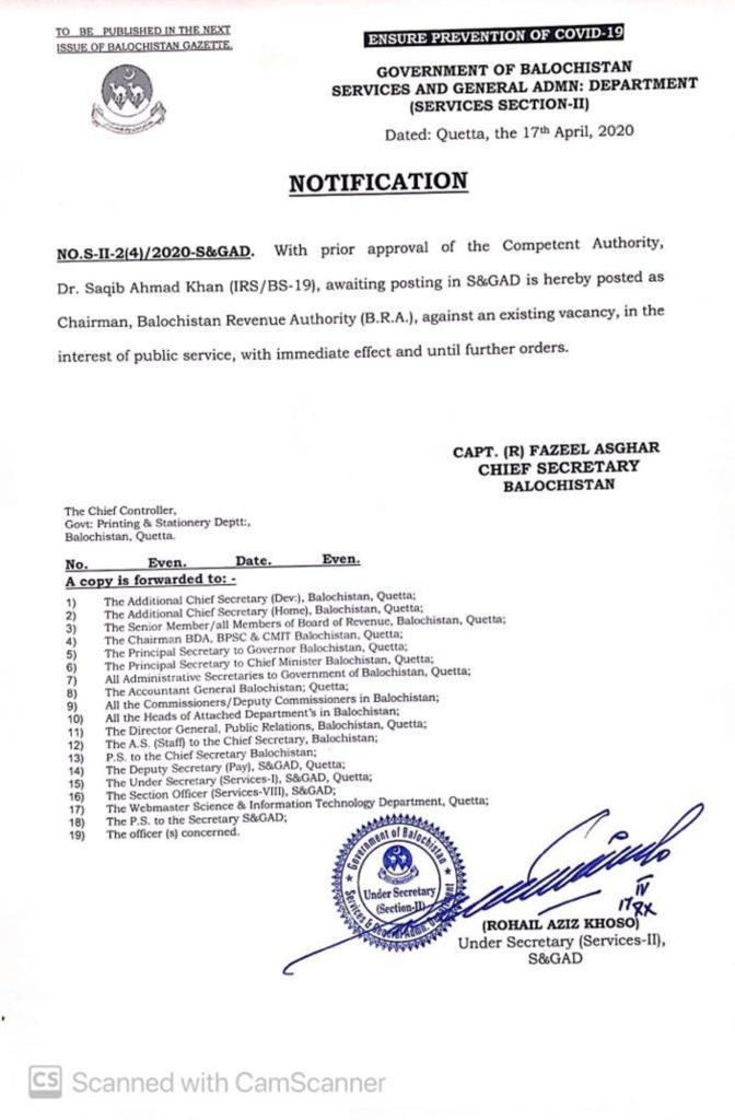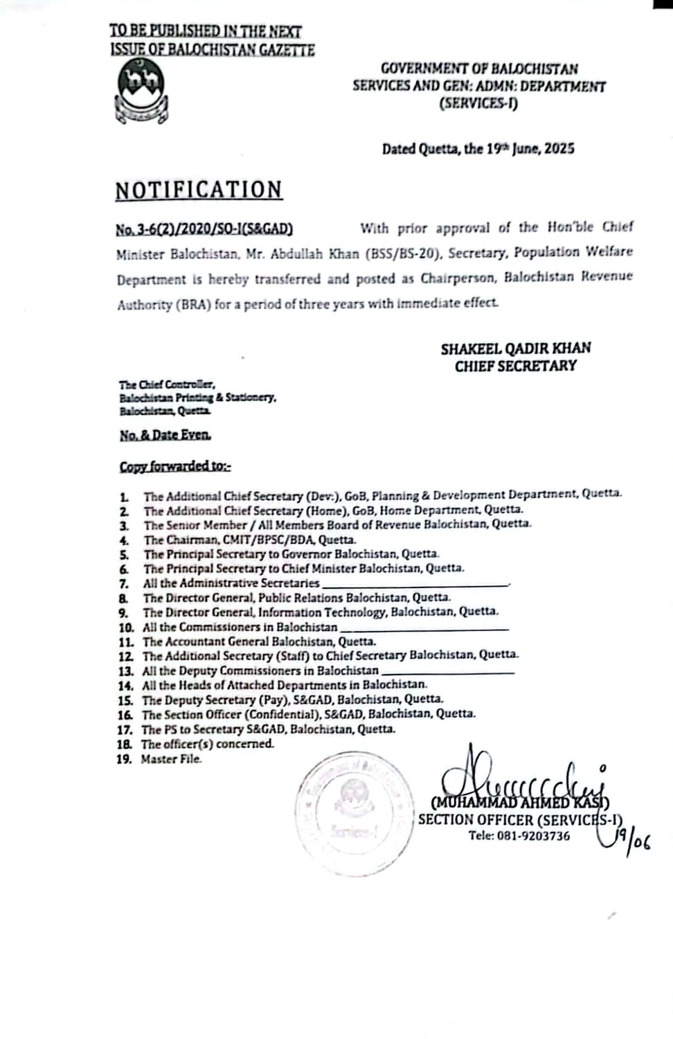 Mr. Abdullah Khan has been transferred and posted as Chairperson Balochistan Revenue Authority w.e.f. 19th June, 2025 — Notifications_Administration