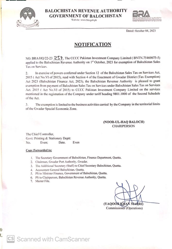 Notification CPEC PROJECT Pak-china technical & vocational Institute of Gwadar Port — Notifications_SalesTax