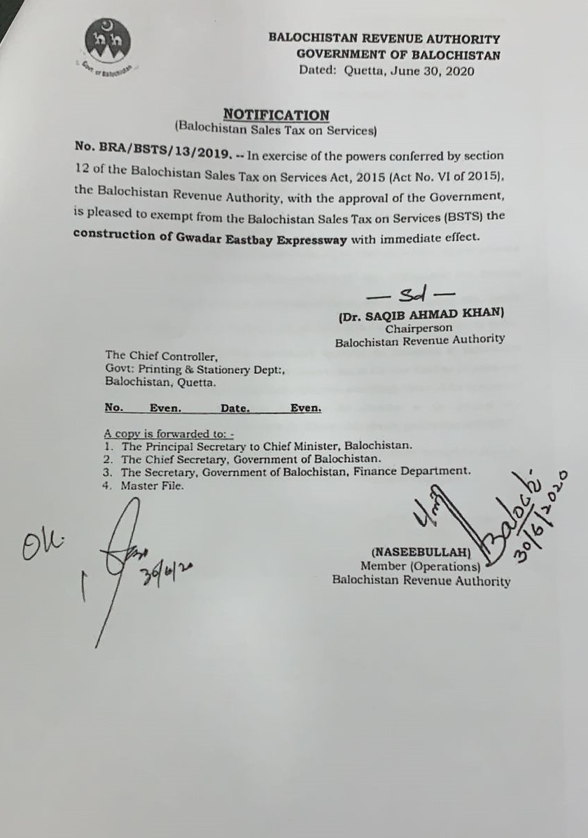 Grant of exemption from payment of BSTS to the construciton of Gwadar Eastbay Expressway — Notifications_SalesTax