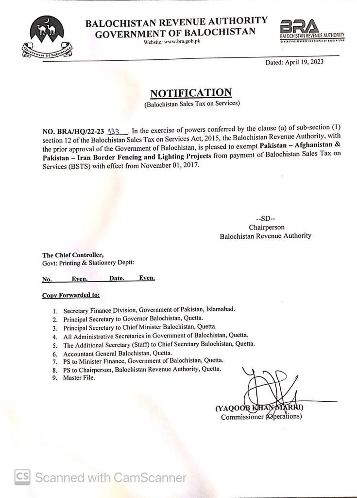 Grant of Exemption from payment of BSTS to Pakistan-Afghanistan & Pakistan-Iran Border Fencing and Lighting Projects w.e.f. 01-11-2024 — Notifications_SalesTax