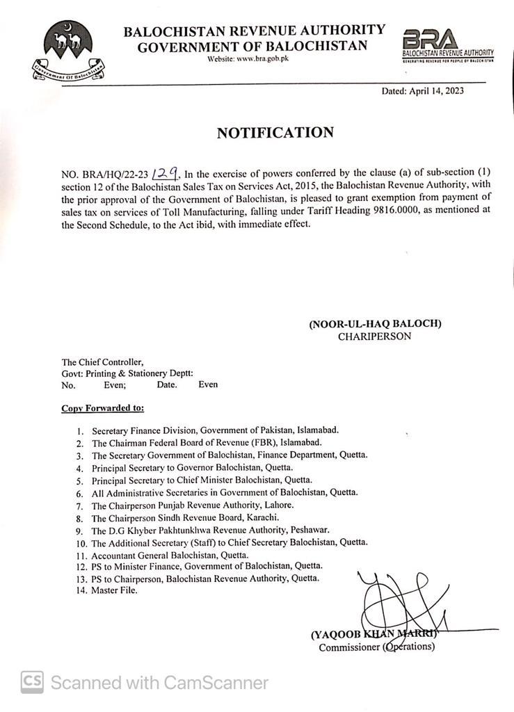 Grant of Exemption from payment of BSTS to Toll Manufacturing — Notifications_SalesTax