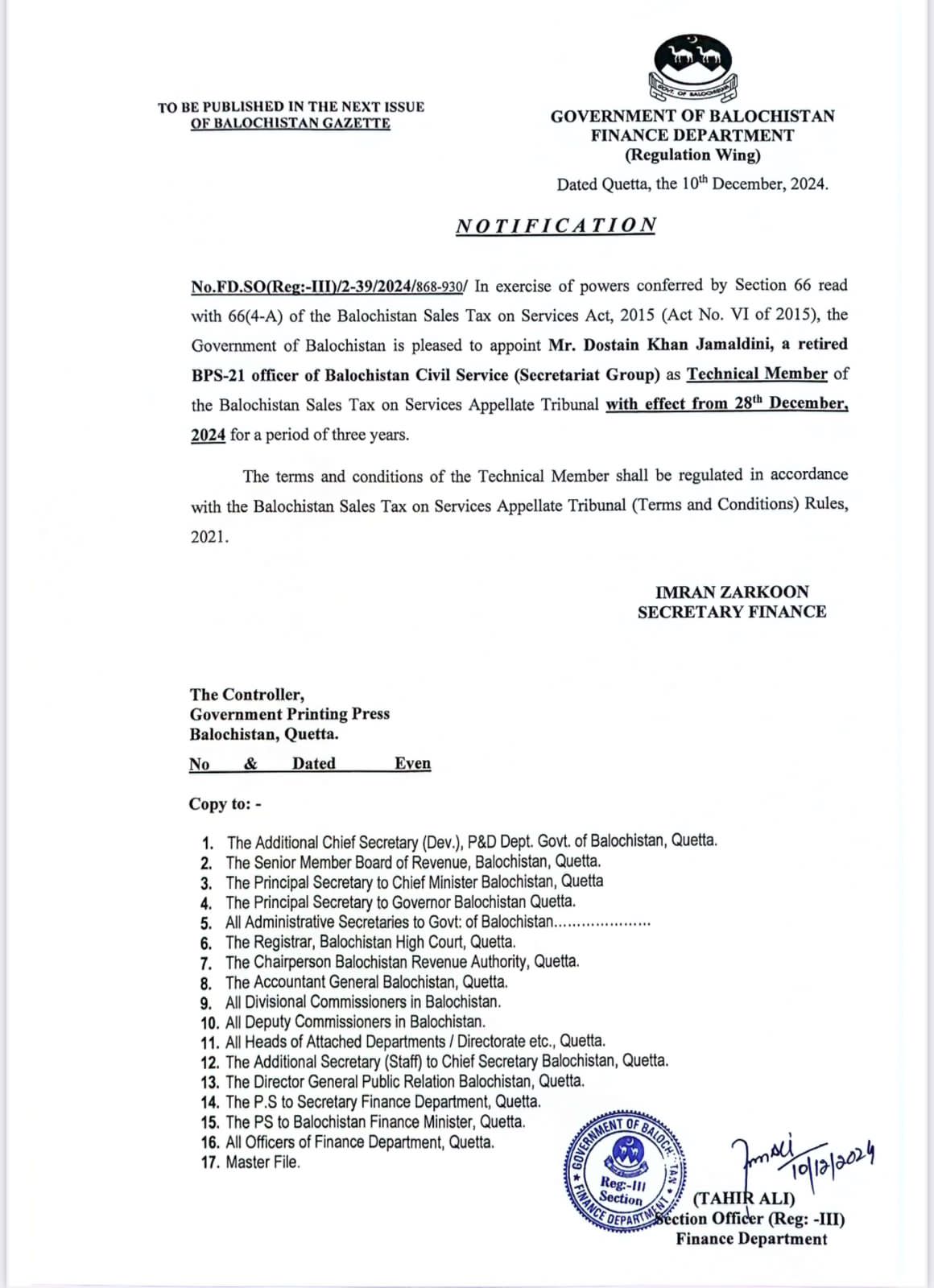 Mr. Dostain Khan Jamaldini appointed as Technical Member BSTS Appellate Tribunal — Notifications_Administration